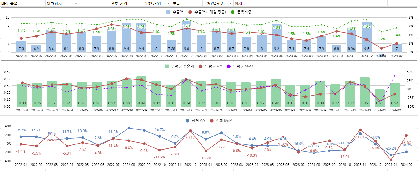 이차전지 품목도 총 수출액과 일평균 수출액 모두가 증가했습니다. 1월 수출이 정말 최악이었거든요. 2월에 반등하면서 어쩌면 2차전지 섹터 주가에도 긍정적인 흐름이 나올 수 있을 것 같습니다.
