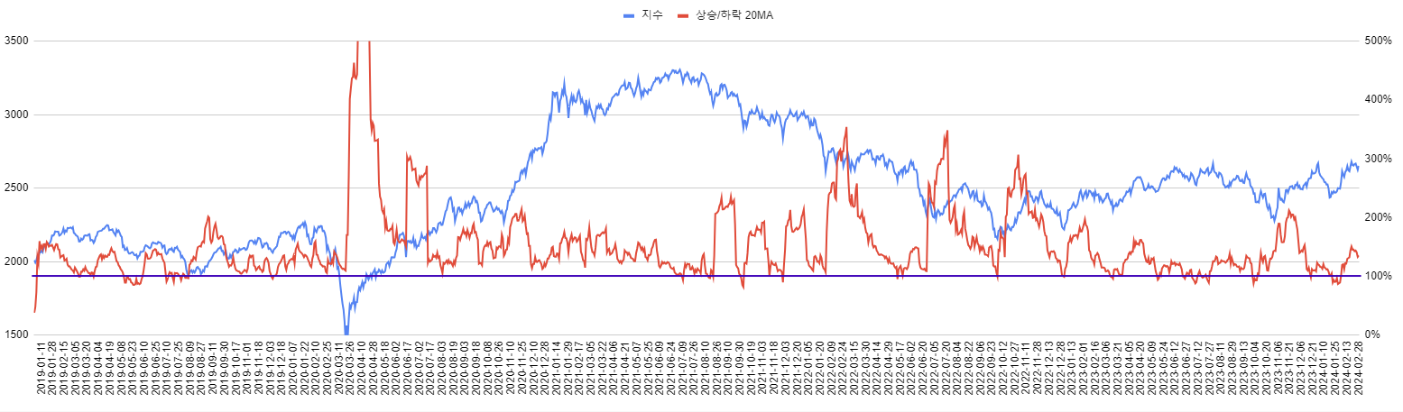 위 차트의 빨간선이 코스피 상승종목의 하락종목 대비 비율의 20일 평균선입니다. 잘 보시면 빨간선이 고점을 찍고 하락할 때 (= 시장의 폭이 좁아지기 시작할 때) 지수도 하락하는 패턴을 보여줍니다. 시장의 폭이 좁아지면 지수의 하방압력이 강해진다는 의미입니다.
