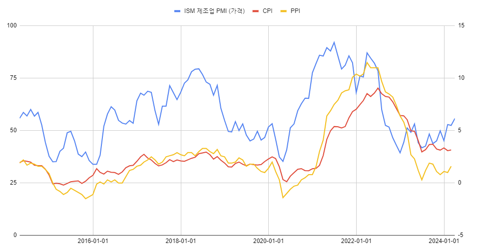 파란선이 ISM 제조업 PMI의 Price, 빨간선이 CPI 상승률, 노란선이 PPI 상승률입니다.