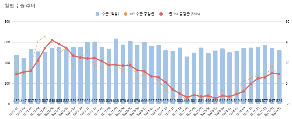 총 지수는 50.3으로 예상치 47.8을 크게 상회했습니다. 그리고 22년 11월 이후 16개월만에 50을 넘어서며 '확장' 국면에 들어섰네요. 앞서 공유한 한국의 대미 수출의 꾸준한 증가와 연계하여 생각해 보면 앞뒤가 맞죠.