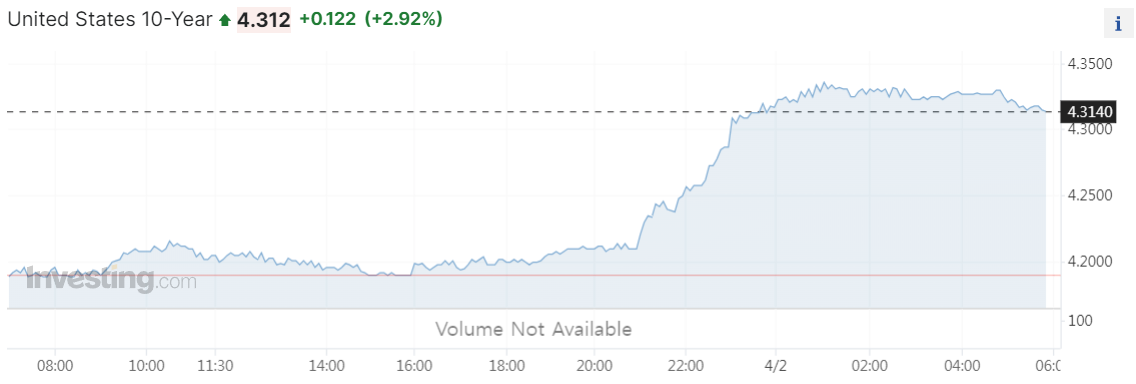 지표 발표 직후 미국채 10년물 금리가 급등합니다. 단기물도 마찬가지구요. 자연스레 달러도 강해집니다. 시장의 기준금리 인하에 대한 기대치가 계속해서 낮아지는 분위기입니다.