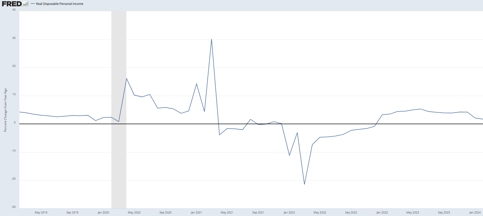 미국 가계 실질 가처분 소득의 YoY 상승률 추이입니다. 24년부터 증가세가 눈에 띄게 약해지고 있습니다. 아직 마이너스 대역으로 들어서지는 않았지만 (= 전년 대비 실질 가처분 소득 감소), 소득 측면에서 높은 물가를 받아낼 여력이 눈에 띄게 약해지고 있다는 이야기와 같죠.