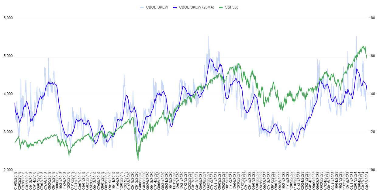 녹색선이 S&P500, 옅은 파란선이 SKEW, 짙은 파란선은 SKEW의 20일 이평선입니다. 추세가 좀 더 잘 보이죠? 짙은 파란선은 여전히 하락 중입니다. 옅은 파란선은 더 심하게 하락하고 있죠. 녹색선 S&P500도 시차를 두고 조정을 받는 중입니다. SKEW는 이미 2월에 고점을 찍고, 2개월 넘게 급격히 하락하고 있는데, S&P500은 4월에 들어서고 나서야 조정에 들어갔습니다. 과거 패턴을 참조할 때 최소한 SKEW가 하락을 멈추는 모습이 확인되기 전까지는 지수 조정의 바닥을 속단해서는 안될 것으로 보입니다.