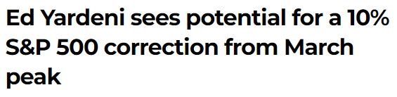 또 다른 유명한 bull인 Ed Yardeni 역시 3월 최고점에서 S&P500이 10% 가량 조정이 있을 것이라 보고 있습니다. 최고점이 5,264였으니 10%면 대략 520포인트가 빠진 4,700 정도를 보고 있는 셈입니다. 이처럼... 월가에서 가장 bullish한 이들조차 아직은 아니라고 하고 있네요.