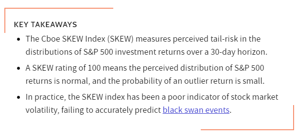 CBOE SKEW라는 지표가 있습니다. 아시는 분들도 많이 계시겠지만, 이 지표는 시장의 단기적인 방향성과 위치를 짚어보는 저의 무기 중 하나입니다. 링크를 통해 조회하실 수 있는데요. https://www.investing.com/indices/cboe-skew