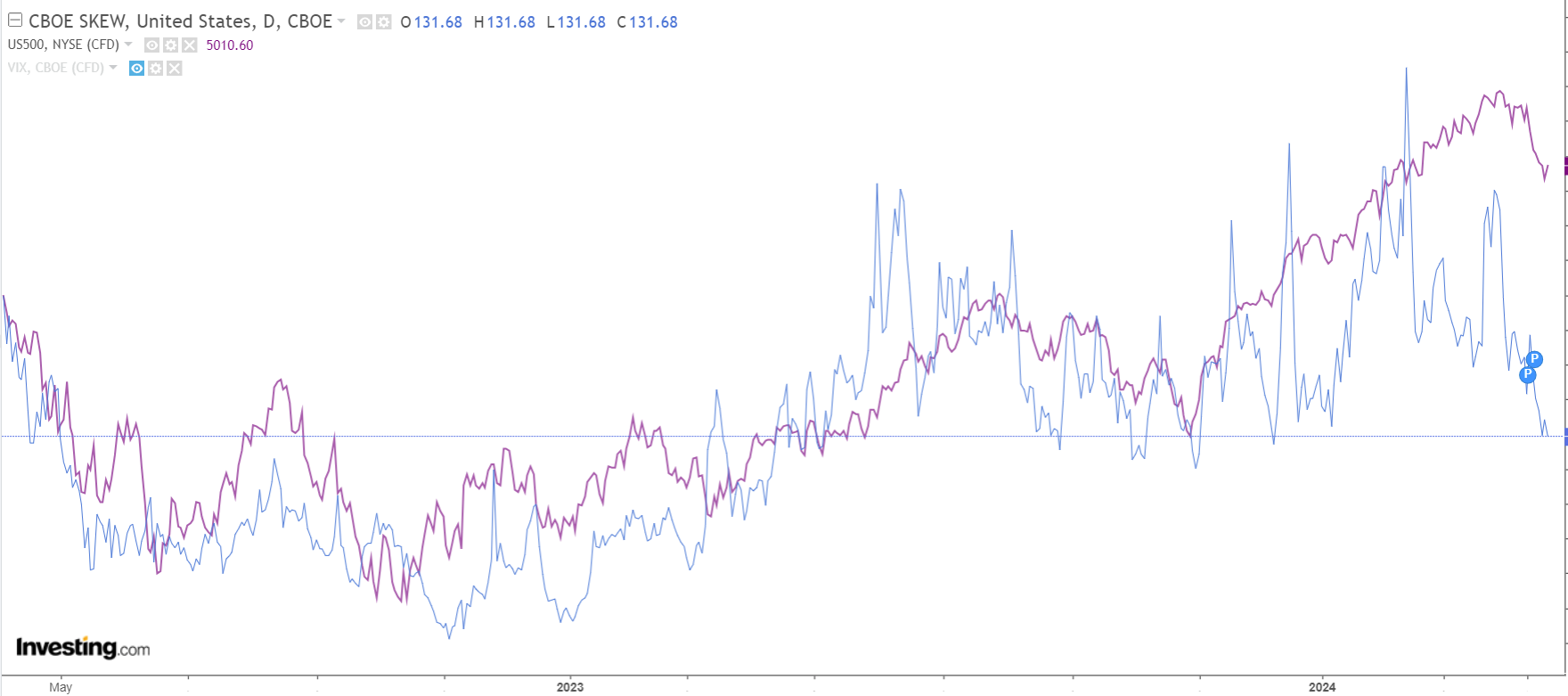 보라선이 S&P500 지수, 파란선이 CBOE SKEW 입니다. 파란선이 상승세에 있을 때, 보라선도 상승세를 타죠. 파란선이 고점에서 하락하기 시작하면, 시차를 두고 지수도 하락합니다. 시차는 일정하지 않습니다만, 결국은 추세가 동행합니다. 파란선 SKEW의 등락이 워낙 심하니 좀 다르게 보죠.