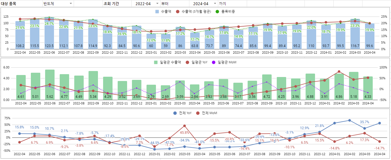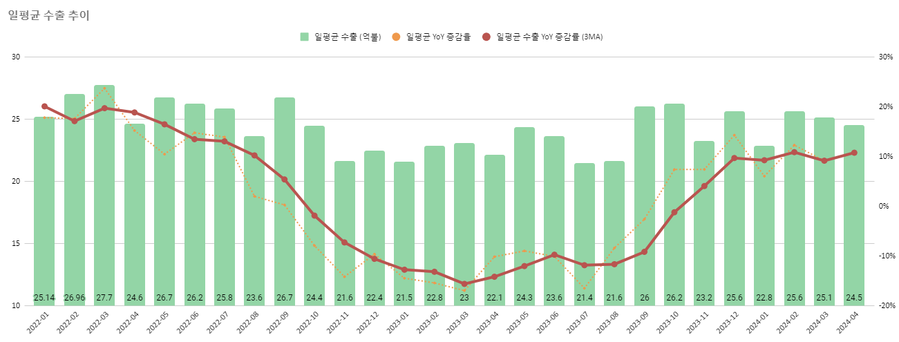 거듭 강조했지만 중요한 것은 일평균 수출액입니다. 4월의 조업일 수는 3월 대비 0.5일 더 많은 23일입니다. 총 수출금액이 소폭 감소했지만, 조업일 수는 늘어났으니, 일평균 수출금액은 더 하락하겠죠? 25.1억불 (3월) 에서 24.5억불 (4월) 로 2.4% 가량 감소했습니다. 일평균 수출액은 2월부터 2개월 연속 감소하고 있습니다.