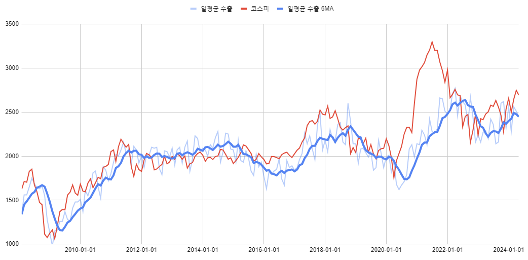일평균 수출이 꺾이면서 코스피 지수의 상승세도 장담하기 어려워졌습니다. 위 차트의 짙은 파란선은 일평균 수출의 6개월 이평선입니다. 살짝 고개를 숙이고 있죠? 코스피 지수가 일평균 수출액을 선행하기에 꺾이는 일평균 수출로 인해 미리 반등한 코스피의 상단이 보이지 않는가 생각됩니다.