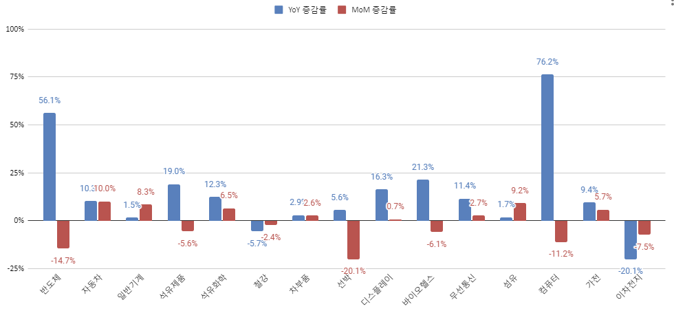 품목 별 수출 증가율입니다. 파란 막대는 YoY, 빨간 막대는 MoM. 올해 한국 수출의 반등을 이끌어온 반도체 수출이 한풀 꺾였습니다. 작년 말에 부진했던 자동차 수출의 회복세가 이어지고 있습니다.