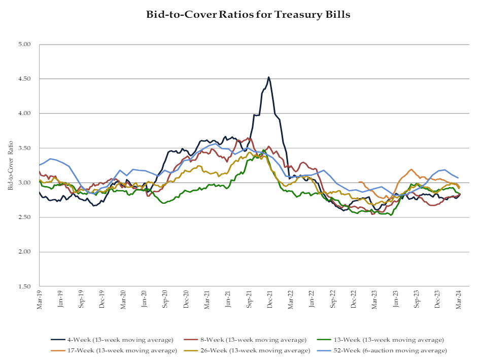 재무부 2분기 QRA 자료를 보면 여러 만기의 미국채들의 응찰률 추이 차트가 있습니다. 보시면 23년 말 이후로 미국채에 대한 수요가 약해지고 있음을 알 수 있습니다. 단, 1~2달 만기의 단기국채는 오히려 응찰률이 오르고 있죠. 요건 역레포에 묶인 유동성이 단기국채로 쏠리면서 단기국채에 대한 수요가 강해졌음을 보여줍니다. 같은 기간 재무부에서는 어마어마하게 단기채 발행량을 늘렸죠? 참 생각할수록 묘안입니다. 이 부분은 과거 글에서 다룬 적 있으니 참고해 주시구요.
