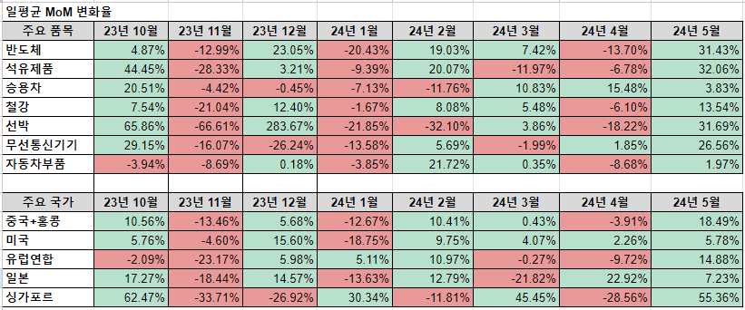 앞서 언급한 바와 같이 조업일 수의 감소가 수출 총액의 감소보다 훨씬 크기에 일평균 수출은 크게 개선되었습니다. 표 가장 우측의 24년 5월을 보면 모든 셀이 녹색입니다. 전월 대비 증가했다는 의미입니다. 모든 주요 품목과 모든 주요 권역으로의 일평균 수출이 꽤 의미있게 증가했습니다.