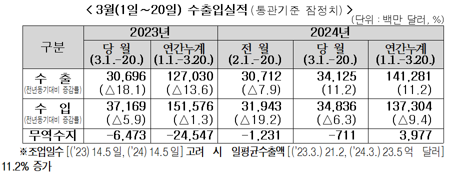 연간 누계를 보면... 올해 1~5월 20일까지 수출액은 23년 동기간에 비해 8.5% 증가했죠. 반대로 동기간의 수입액은 7.7% 감소했습니다. 수출 경기는 회복세를 보이고 있지만, 내수 경기는 부진한 모습이 간접적으로 확인이 된다고 할 수 있겠네요.