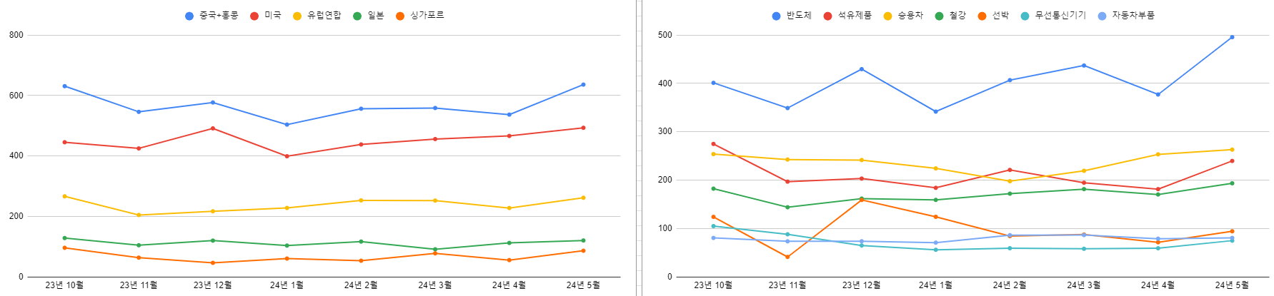 이번엔 차트로 보죠. 증가율이 아니라 권역별 (좌측), 품목별 (우측) 수출액입니다. 두 차트 공히 24년 5월에 거의 모든 지점에서 상승하고 있음을 알 수 ...
