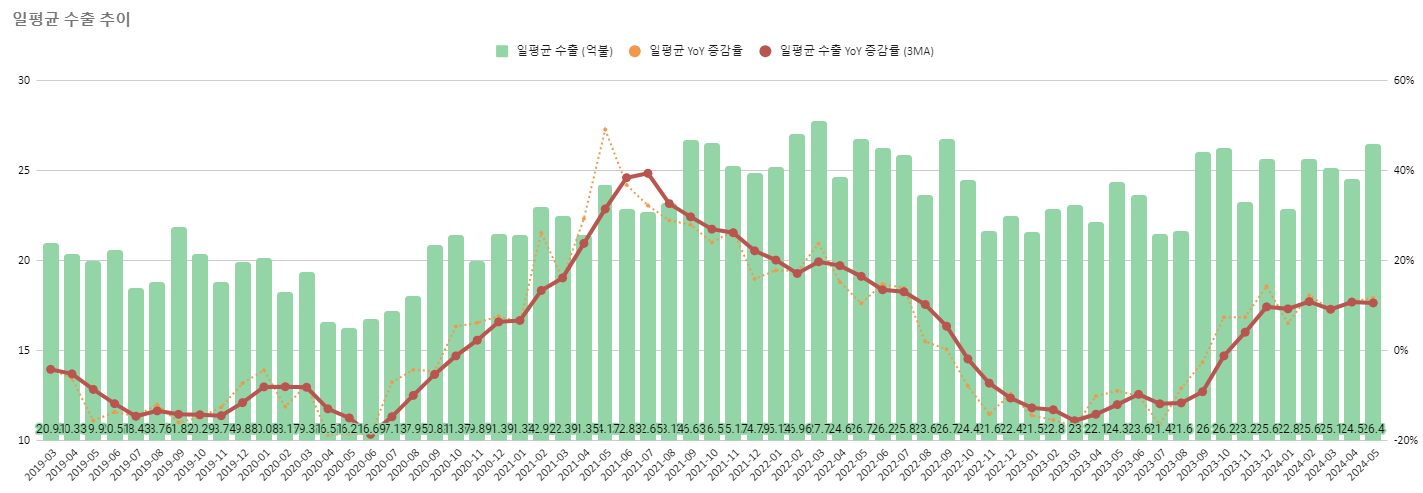 초록색 막대가 일평균 수출금액인데 보시다시피 5월에 26.4억불까지 증가했습니다. 이는 팬데믹 이후 수출 최호황기에 필적하는 수준입니다. YoY로 11.7%, MoM으로 7% 증가했습니다. 이렇게만 보면 좋아 보입니다.
