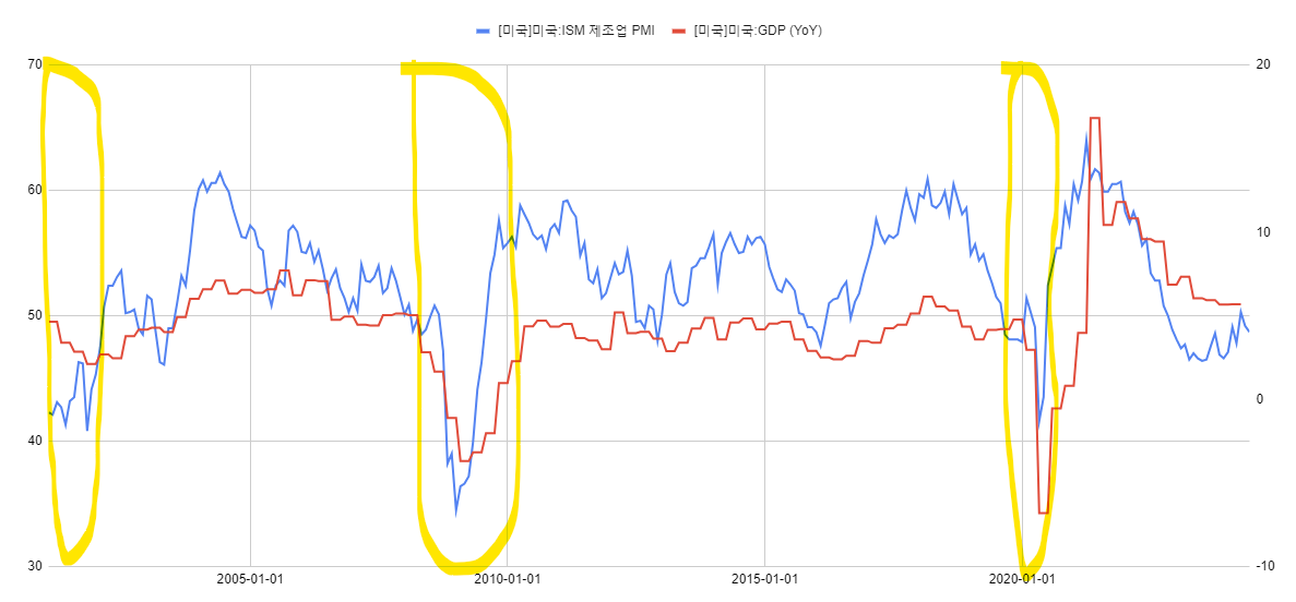 당연한 이야기지만 경기침체 시기에 미국 GDP 성장률이 급락합니다. 여기서 끝이 아니죠. 잘 보시면 파란선 ISM 제조업 PMI가 미국 GDP 상승률을 선행하는 것을 알 수 있습니다. ISM 제조업 PMI가 대표적인 경기선행지수 중 하나인 데에는 다 이유가 있는 거죠.