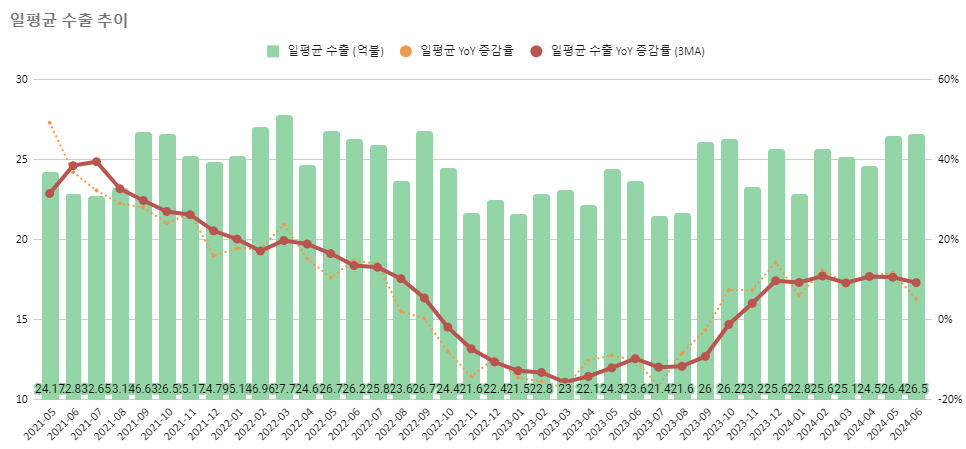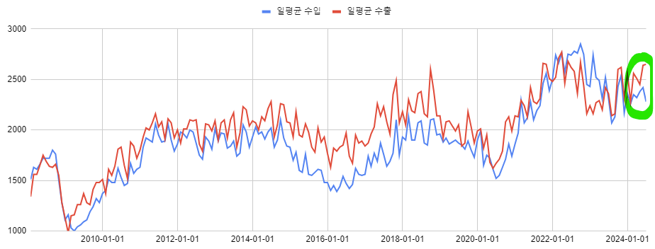 파란선은 일평균 수입금액, 빨간선은 일평균 수출금액 추이입니다. 거의 같은 방향성을 가지고 움직이는 것이 보입니다. 그런데, 우측 녹색 형광펜 부분을 보시면 다이버전스가 크게 발생했죠? 24년부터 수출은 빠르게 증가하는데, 수입은 반대 방향으로 빠르게 감소하고 있습니다.