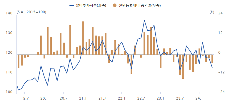 수입은 내수 소비는 물론이거니와 국내 설비투자와도 관련이 있죠. 수입이 수출만큼 늘어나지 못하고 있다는 것은 내수와 설비투자가 매우 부진하다는 의미입니다. 관련된 대표 지표를 보면...