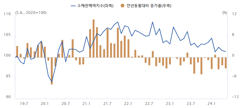 한국 소매판매액 지수는 22년 2월부터 지금까지 계속해서 급격하게 하락하고 있고...