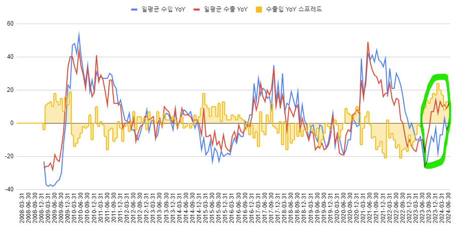 보시면 일평균 수출과 수입의 YoY 상승률은 거의 동행하는 것을 알 수 있죠. 그런데, 녹색 형광펜 구간을 보면 수출 YoY 상승률에 비해 수입 YoY 상승률이 크게 뒤쳐져 있는 것이 보입니다. 그 간극을 노란 영역으로 표현했는데, 딱 봐도 알겠지만 수출과 수입 YoY 상승률의 간극이 역대급으로 오랫동안 벌어져 있음을 알 수 있습니다.