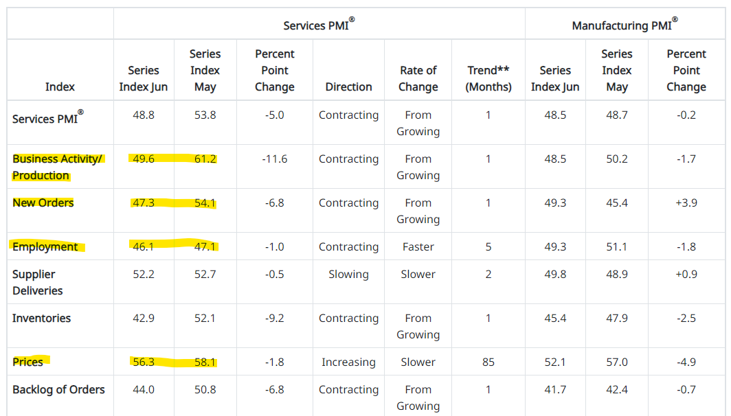 ADP 고용통계도 예상치에 미달됐고, 신규/연속 실업수당 청구건수도 모두 예상치를 상회했죠. 여기에 ISM 서비스 PMI까지 폭락했습니다.