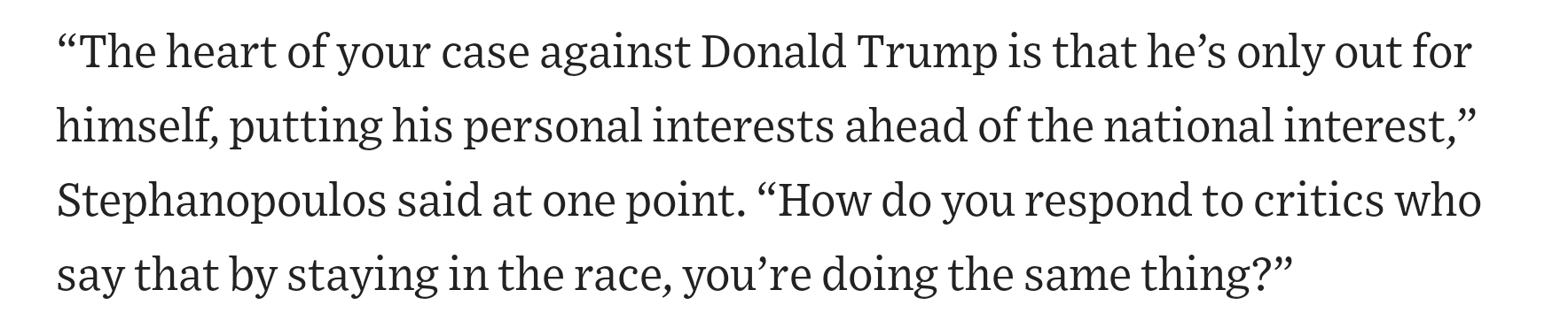 가장 재밌었던 질문... "당신이 트럼프를 공격하는 요지는 그가 공익보다 사익을 추구한다는 점인데, 후보직을 고수하는 당신도 결국 사익을 우선시하는 것 아니냐는 비평에 대해 어떻게 생각하십니까?" ... 답변은 "Oh, come on. 그런 이야기를 하는 사람들은 자기들이 무슨 말을 하는지도 모르는 사람들. 말도 안된다."....