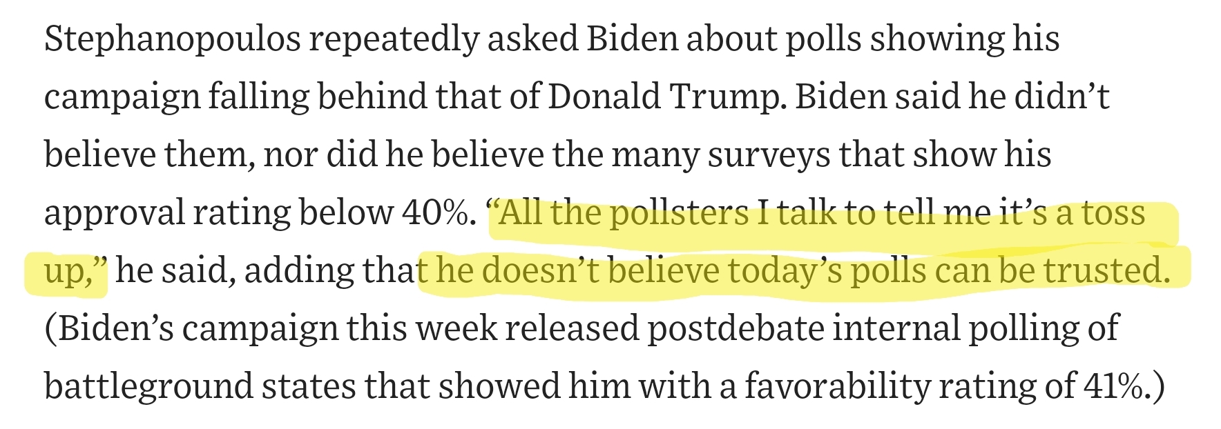 진행자가 최근 설문조사에서 트럼프에게 뒤지기 시작한 점, 정권 지지율이 40% 이하로 내려앉은 점에 대해 반복적으로 물었습니다. 바이든은 안 믿는답니다. 자기가 들은 이야기로는 toss-up, 즉 반반이라고... 네... 현실부정 상태입니다.
