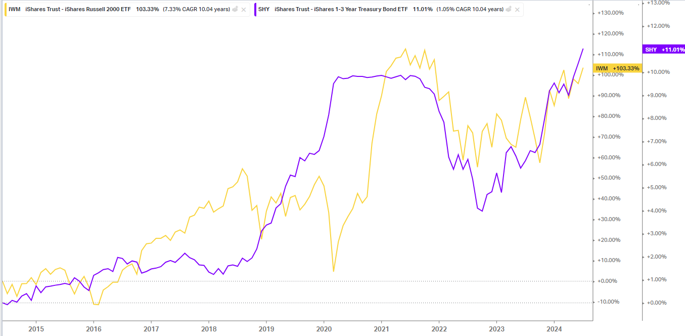 과거 10년 추이를 보면 러셀2000은 전반적으로 단기 국채 금리와 연동되어 움직이는 경향이 강합니다. 보라선 SHY의 현재 레벨은 21년 고점을 돌파했습니다. 반면 노란선 러셀 2000은 아직 넘지 못하고 있죠. 이를 보면 러셀 2000에 좀 더 상승 여력이 남아있을 수도 있다고 할 수 있겠네요. 현재 시장의 기준금리 인하 기대치가 높아질수록 유리해 보입니다.