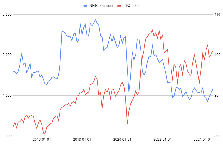 먼저, 상식선에서 생각해 보면 중소기업 업황지수와 러셀2000 주가지수 간에 상관관계가 있을 것으로 보이죠?