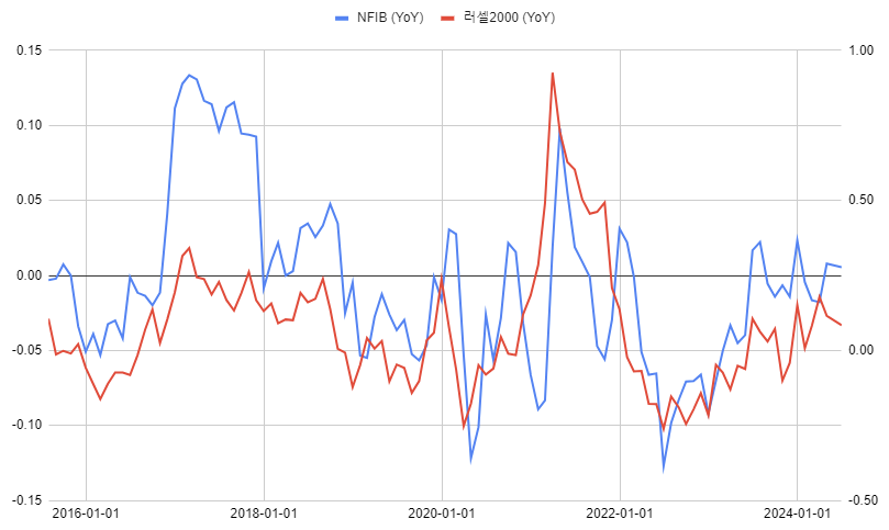 파란선이 NFIB 업황지수, 빨간선이 러셀2000. 얼핏 보아서는 같은 추세로 움직이는 것 같아 보이지 않습니다. 큰 추세는 다르게 움직이는 것 같지만 구간을 짧게 나누어서 보면 그래도 동조되어 움직이는 모습이 있죠. YoY로 바꿔서 봅시다.