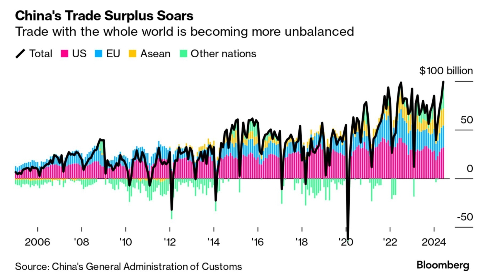 반면, 중국 무역수지 흑자는 계속해서 이어지고 있습니다. 수출은 잘되고 있지만, 내수는 엉망인 상태... 한국과 유사하죠?