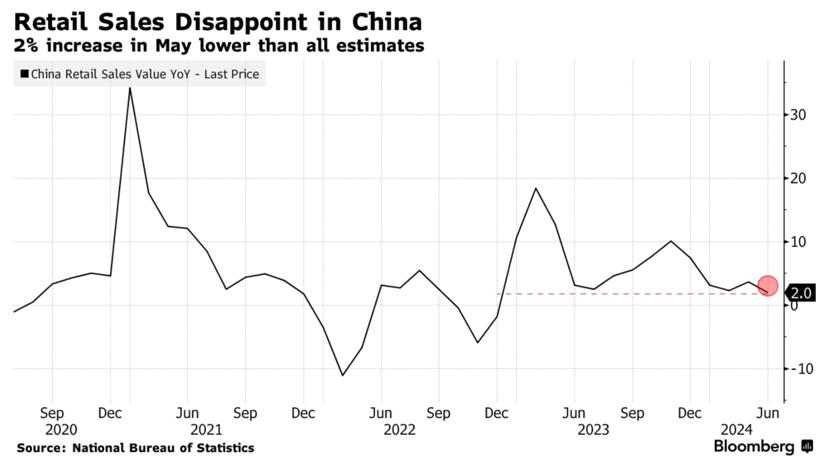 중국 소매판매는 지속적으로 둔화된 상황이 유지됩니다. 24년에는 도무지 반등의 기미가 안 보이네요.