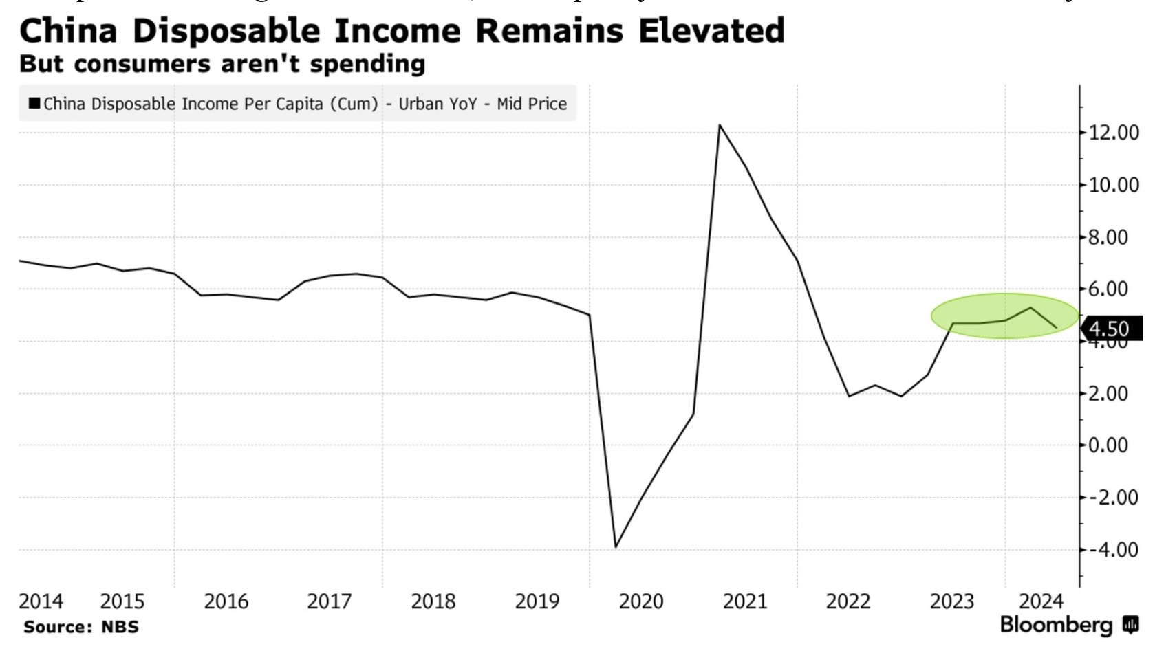 딱히 중국 소비자들이 돈이 없어서는 아닌 모양입니다. 가처분 소득 증가세는 여전히 유지되고 있습니다.