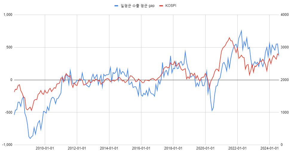 어쨌든, 코스피와 일평균 수출 간의 상관관계로 앞으로의 흐름을 한 번 주제넘게 짚어보겠습니다. 부끄러운 관계로 이 글도 블로그에만 포스팅합니다.