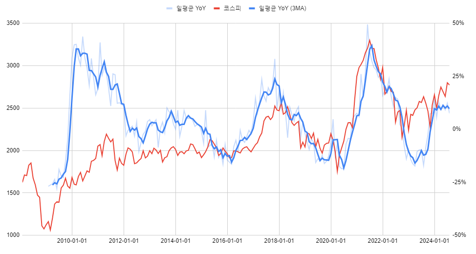 코스피가 일평균 수출 YoY를 좀 앞서 나간 듯 하다.