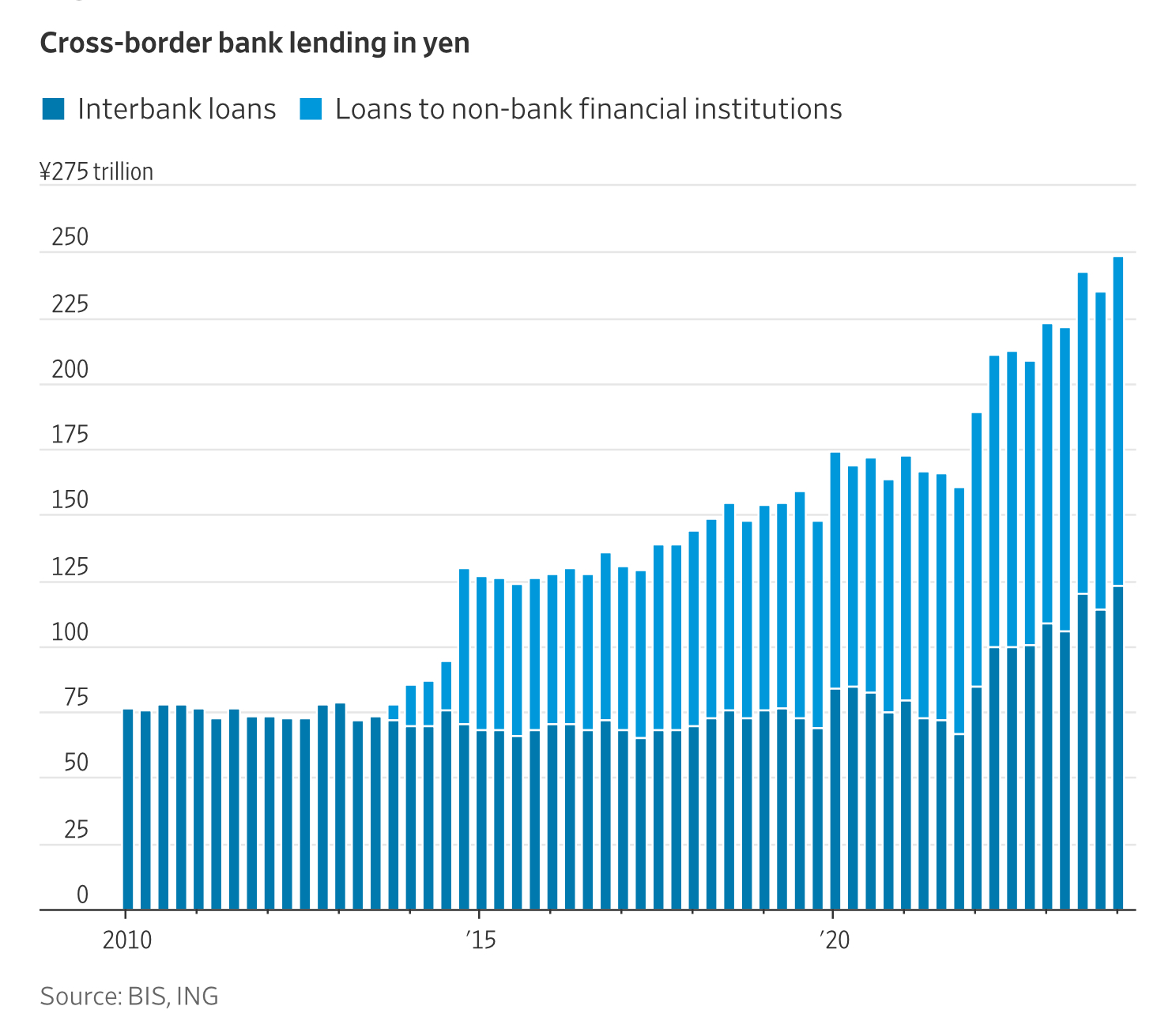 이거야 뭐 뻔한 거죠. 엔화가 약하면 약할수록 엔캐리 트레이드의 매력은 높아집니다. 매력이 높아질수록 일본에서 엔화를 땡겨가려는 수요는 강해지죠. 그 결과가 위 차트입니다. 일본 내 은행들의 해외 엔 대출 규모 추이입니다. USD/JPY가 오를 때마다 급증하는 모습을 보여줍니다.
