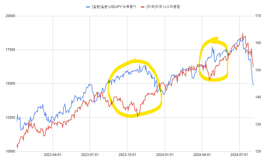 둘의 상관계수는 0.88... 어마어마하게 높죠? 이 정도면 거의 쌍둥이입니다. 물론, 엔캐리 자금 중 얼마가 나스닥으로 흘러들어갔는지는 알 수 없으니, 이것만 보고 논리적인 상관관계가 있다고 단언할 수는 없습니다. 그런데, 사후적으로 보면... 이번에 엔화가 급격히 강해지자 큰 타격을 받았던 자산들에는 전부 엔캐리 자금이 들어가 있다고 해석하는 편이 ...