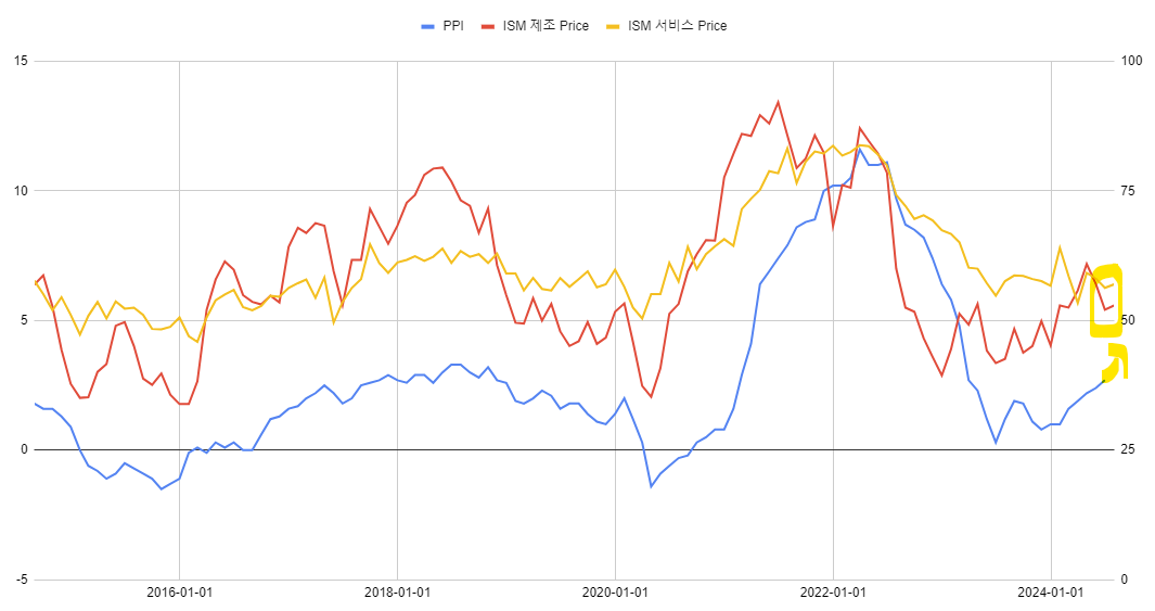 파란선 PPI (YoY), 빨간선 ISM 제조업 Prices, 노란선 ISM 서비스업 Prices.