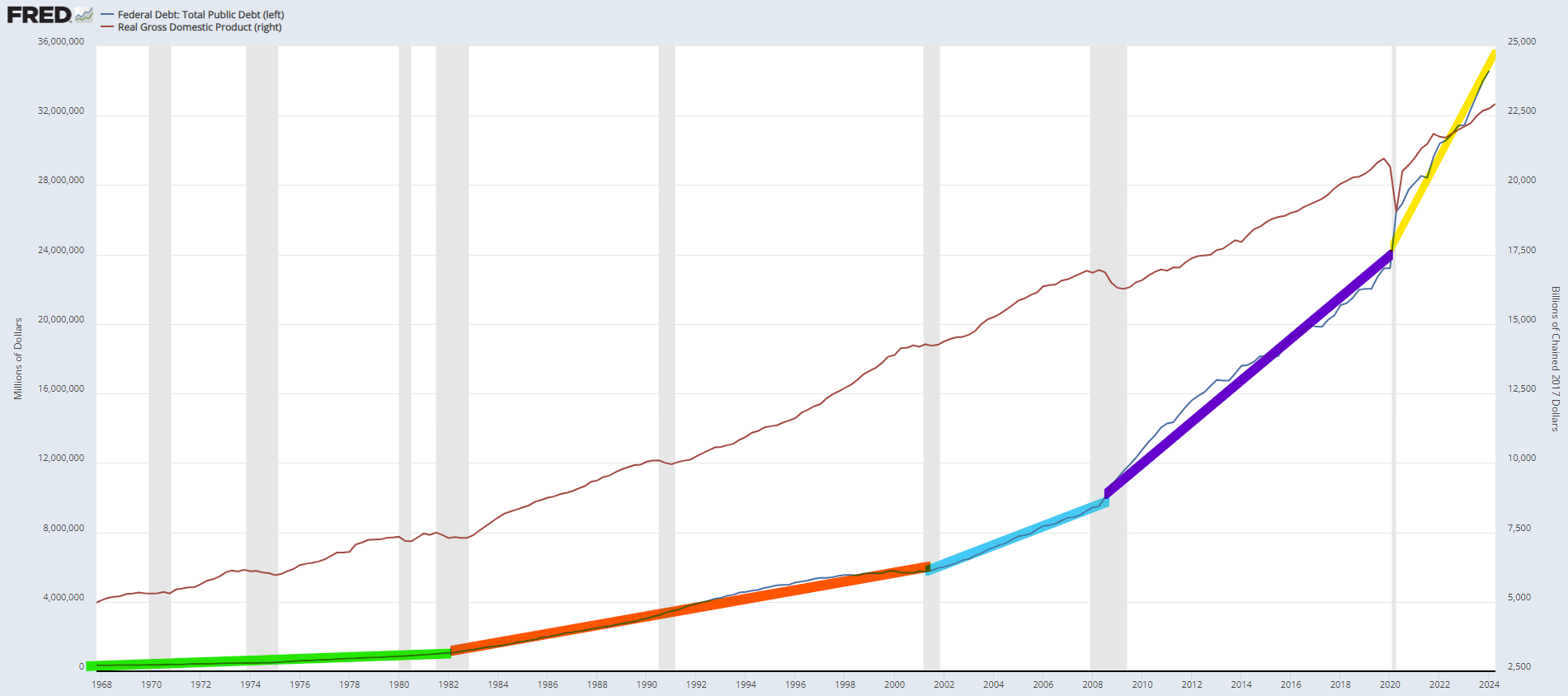 빨간선은 미국 실질 GDP, 파란선은 연방정부 부채입니다. 빨간선은 꾸준히 우상향하고 있죠. 반면, 정부 부채는 기하급수적으로 증가합니다.