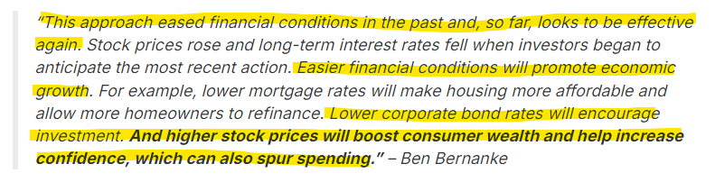 벤 버냉키는 GFC에 대한 대응으로 최초의 QE를 시행한 후 2010년 다음과 같이 말한 적이 있습니다.
