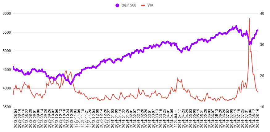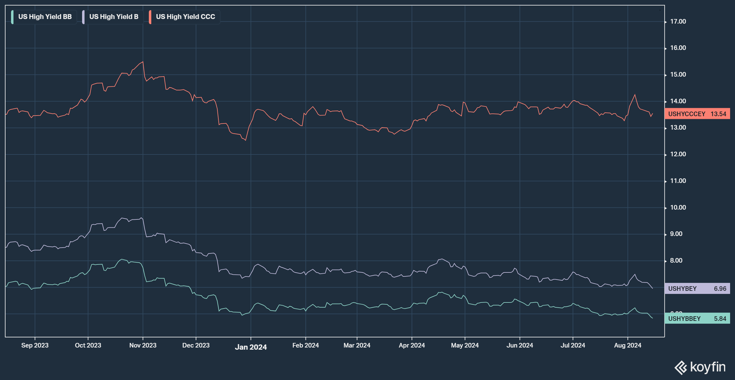 아니나 다를까 하이일드 회사채 금리는 8월 5일 이후 오히려 전보다 더 낮아졌습니다. 경기침체에 대한 우려가 너무 과도했음은 충분히 인정하지만, 그렇다고 해서 지금 경기침체 가능성이 더 낮아진 건가요? 단기적으로 비관과 낙관의 극단을 오가고 있는 시장인 듯 합니다.