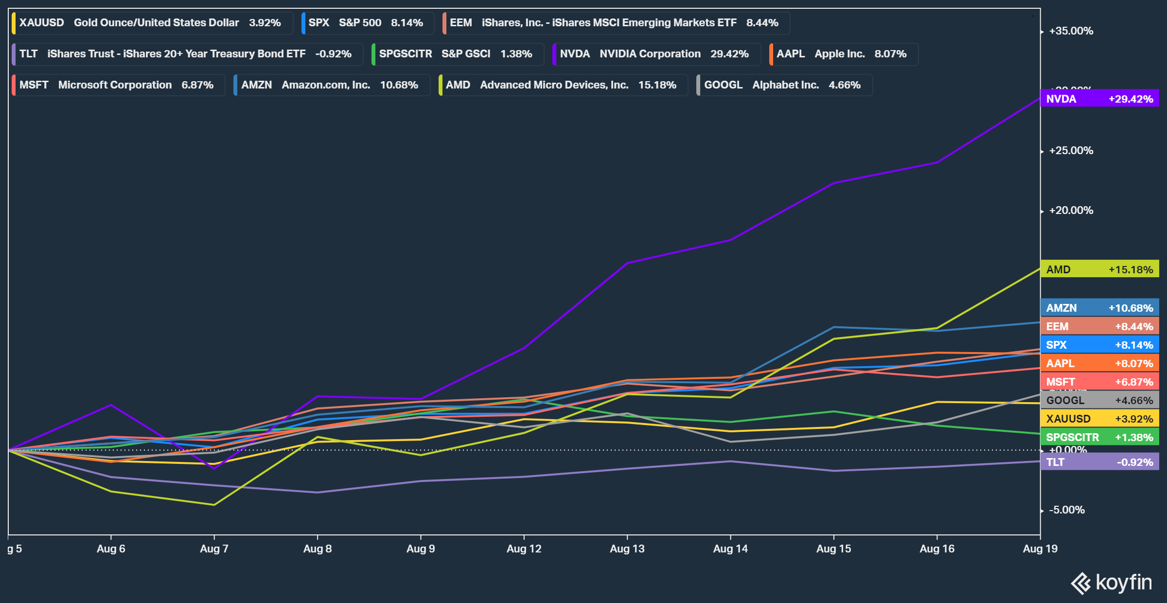 8월 5일 이후 주식, 채권, 금, 원자재 가격 추이입니다.