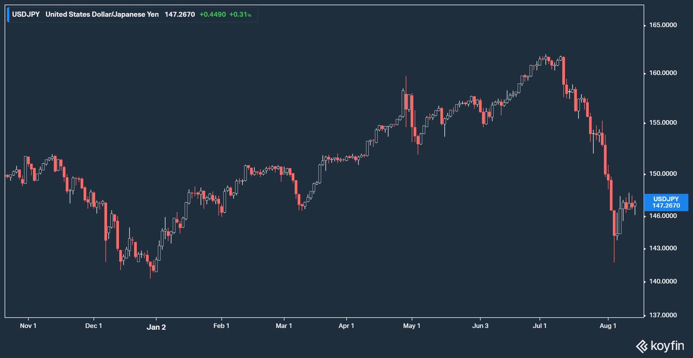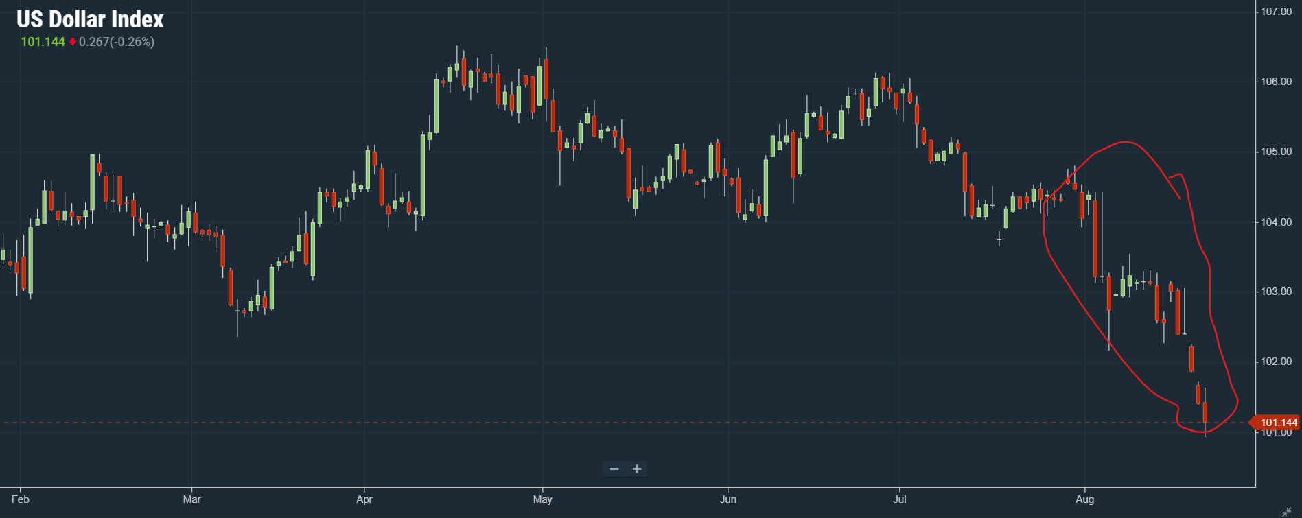 달러 인덱스입니다. 8월에 들어서며 인덱스가 급락합니다. 그만큼 달러가 순식간에 약해졌다는 의미죠. 해당 기간 미국 경기침체 우려가 단기적으로 과도해지면서 국채 금리가 빠르게 하락한 영향이 커 보입니다