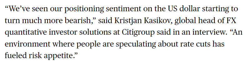 포지셔닝 심리가 USD에 대해 점차 bearish 해지고 있다. 미국 기준금리 인하에 대한 높은 기대가 리스크 선호 심리를 자극하고 있다.
