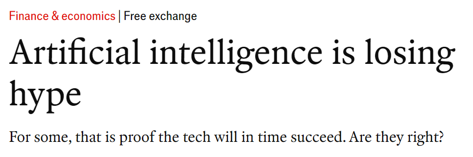 그런데, 최근 Economist 아티클은 Hype cycle의 정합성에 대한 의문을 제기합니다. 좀 더 구체적으로는 현재 AI에 대한 높은 기대치를 꼬집는 내용입니다.