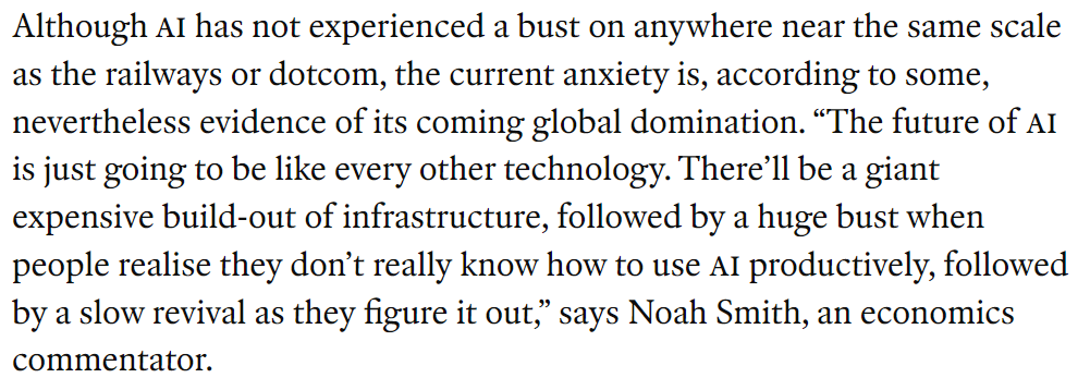 AI가 아직은 대규모 인프라 투자 이후의 대규모 bust를 경험하지는 않았지만, AI를 생산적으로 활용하는 방법을 몰랐다는 것을 깨달으며 bust가 오고, 점차 방식을 깨닫게 되면서 천천히 살아날 것... 이라고 Noah Smith라는 경제 평론가는 이야기합니다.