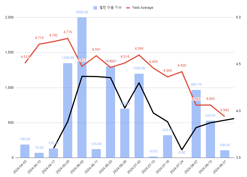 전주에 비해 국채 금리는 계속해서 하락하여 yield average는 계속 낮아지고 있습니다. 국채금리가 낮아지고 있고, buyback 계획 규모도 줄었고, 실제 시행 규모도 계획대비 적었고, issue 기준 acceptance ratio는 소폭 상승했다... 아무래도 옐런 마음 지수는 하락했을 듯 한데...