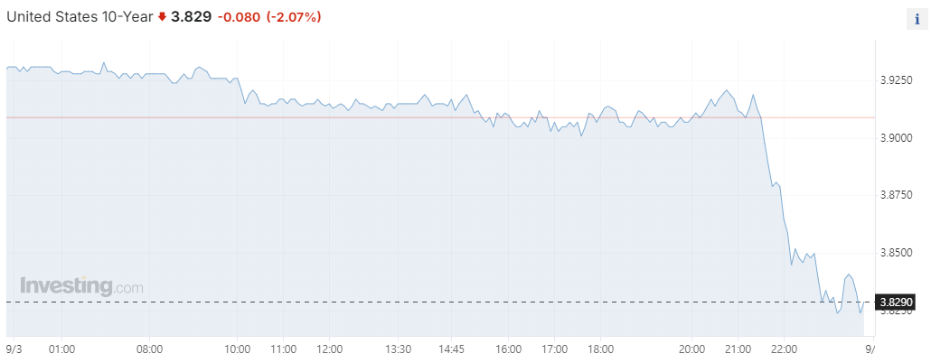ISM 제조업 PMI는 밤 11시에 발표되었는데, 10년물 금리는 9시 반부터 뜬금없는 급락을 보여줍니다. 이거 결과가 미리 샌 거 아닌가... 하는 의심이 들긴 합니다만... 뭐 알 수 없는 노릇이죠.