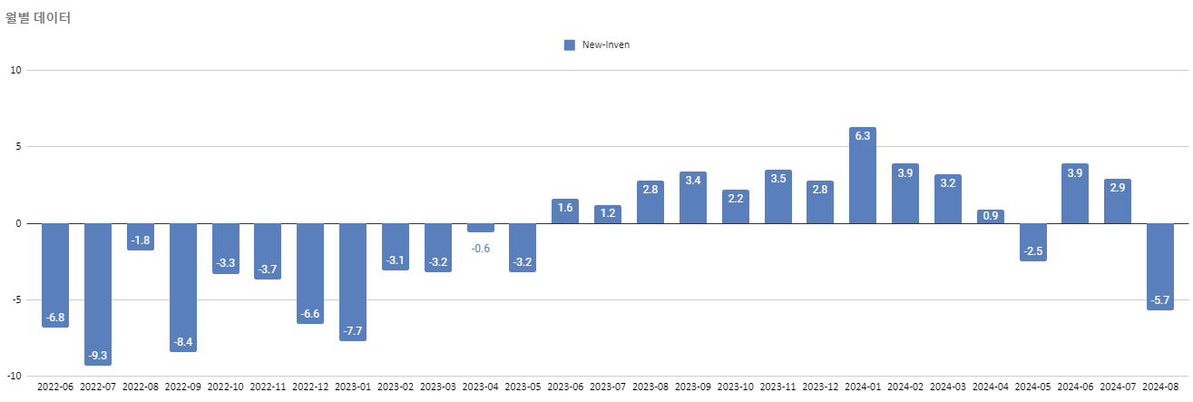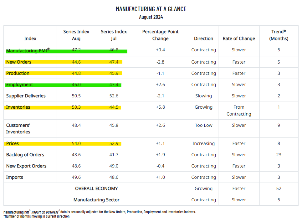 오늘 한국시간 밤 11시에 ISM 제조업 PMI가 발표되었습니다. 예상치를 하회했죠? 위 차트를 보시면 아시겠지만, 24년 4월부터 8월까지 5개월 연속 실제치가 예상치를 하회하고 있습니다.