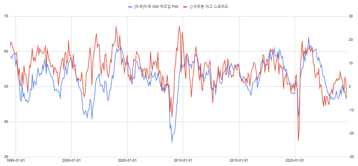 세부 지표의 조합으로 ISM 제조업 PMI의 선행 역할을 하는 New orders와 Inventories의 스프레드는 -5.7%로 크게 하락했습니다 (하단 차트 참조).
