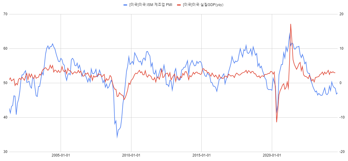 ISM 제조업 PMI에 왜 이렇게 관심을 두느냐... 미국 실질 GDP 상승률을 선행하는 경향이 있기 때문입니다. 그래서 ISM 제조업 PMI가 강력한 경기선행지표로 주목을 받는 ...